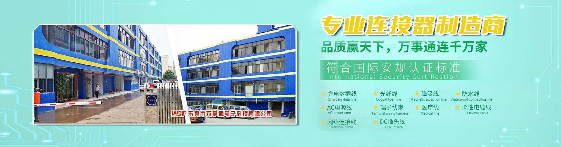 本公司位于中國鄉鎮百顆星之一的廣東省東莞市厚街鎮,建廠于1998年6月,工廠面積5000平方米,地處交通方便;是一家大型連接器配套生產商。本公司生產各種電子,5G智能電子產品,航空、手機、燈飾、汽車、音響、功放、導航、電視、電腦、家用電器、家庭影院、舞臺音響、監控系統等所用端子配線、線束系列、音頻視頻線,各種DC插頭連接線,RGB,DVI,HDMI2.0,USB/TYPE-C,2.0及3.0和3.1,光纖線,醫療線,防水線,磁吸線,拖鏈線,網絡線,電腦周邊連接線,電話線,各國安規認證電源線AC插頭線等等。